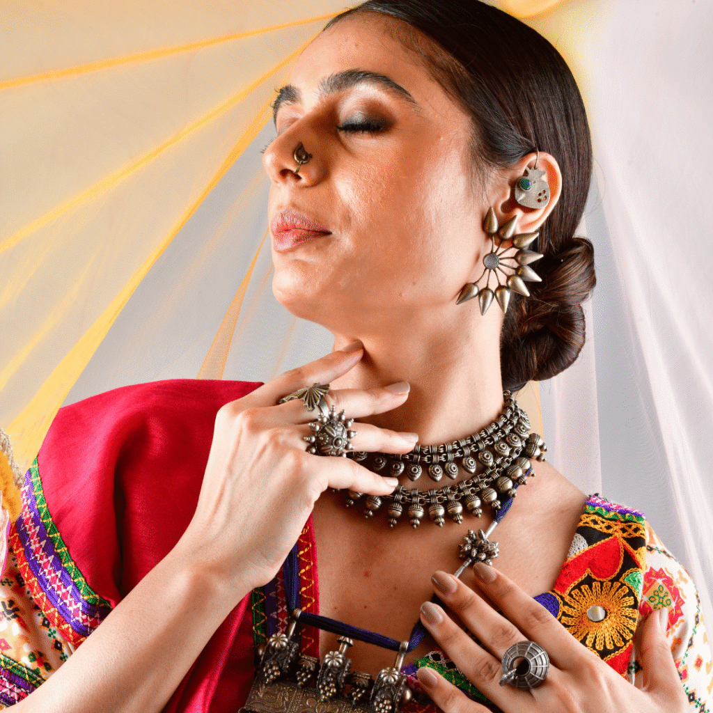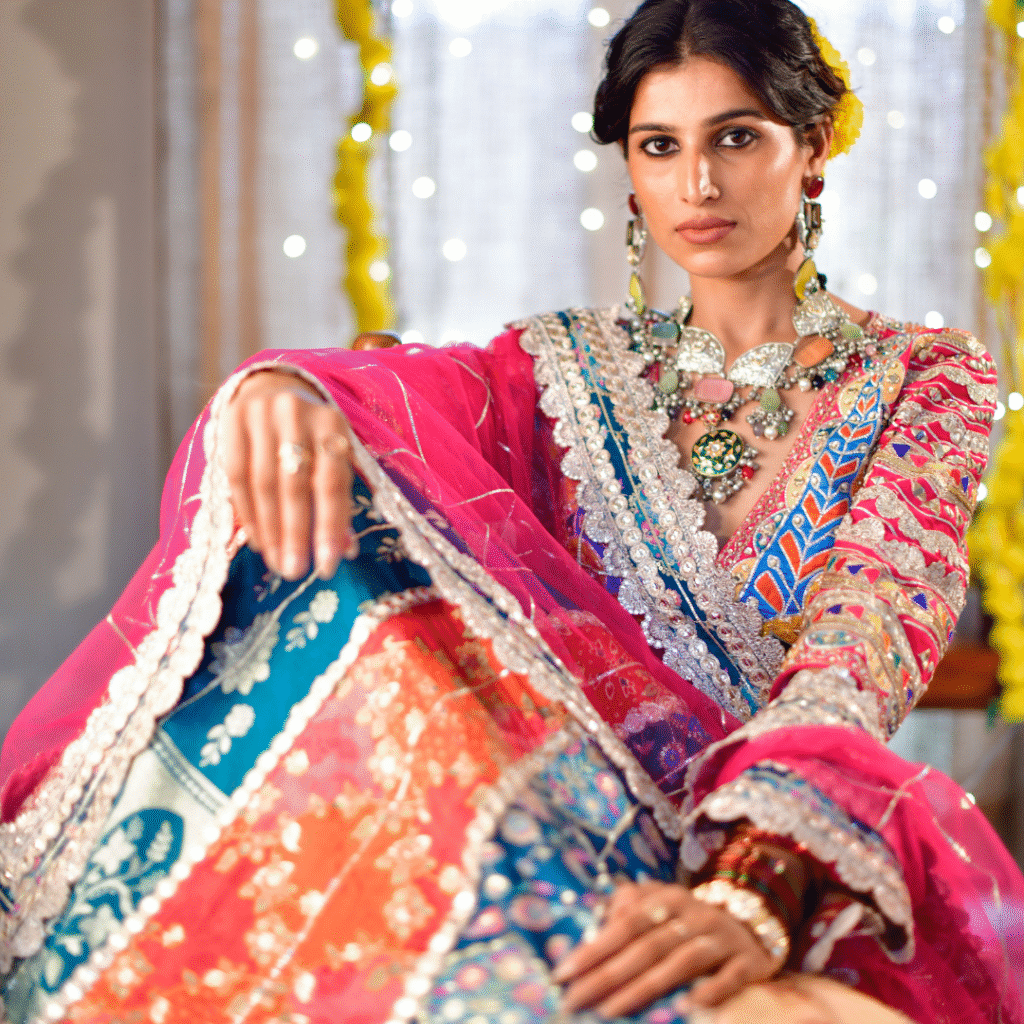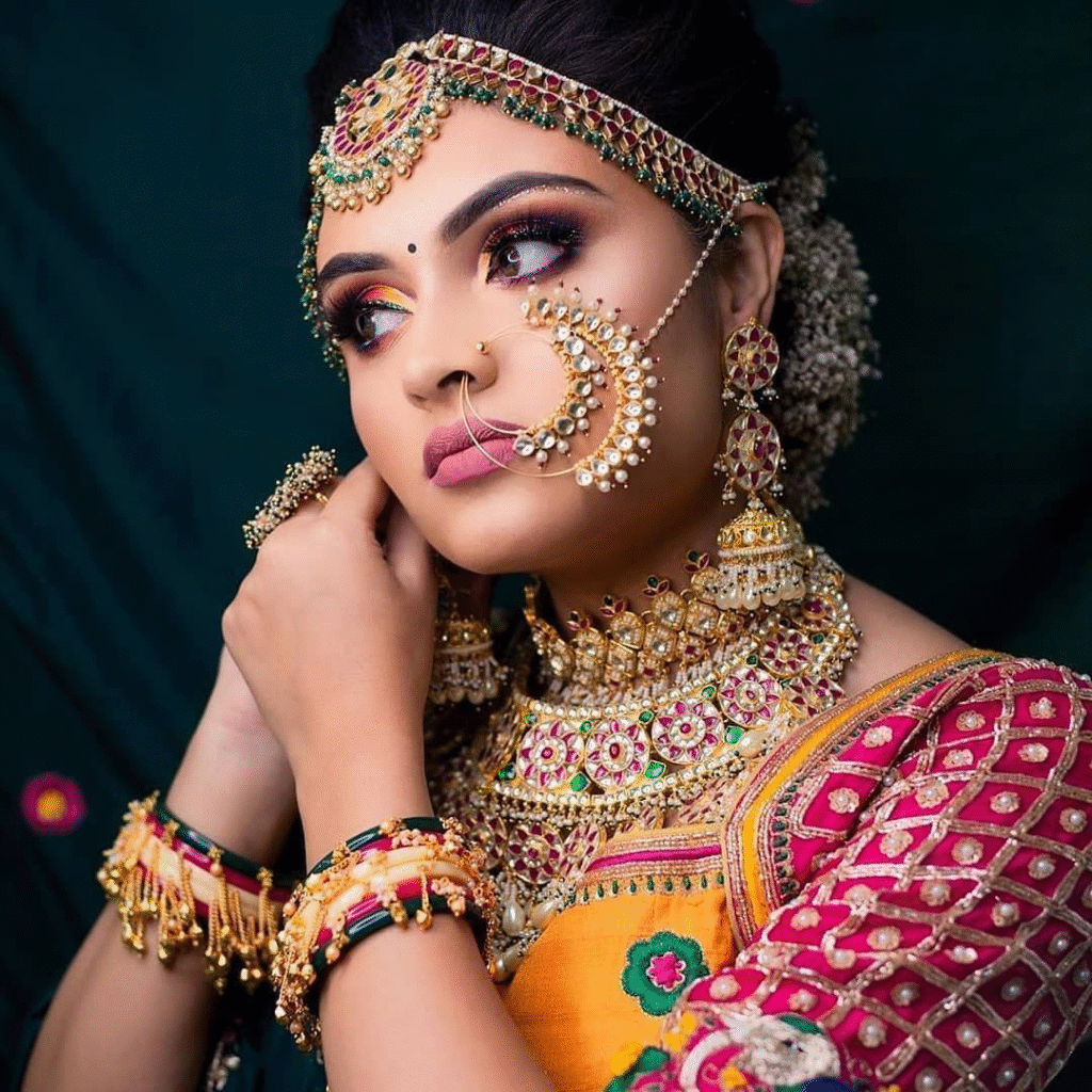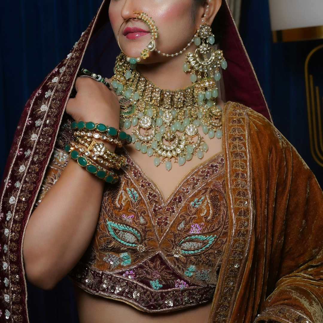 Glimmering jhumkas dangle delicately, their intricate meenakari and pearl work echoing the artistry of bygone eras—all while accentuating the grace of every tilt. A crescent-shaped nath, dotted with pearls, adds a distinctive cultural touch, symbolizing beauty, purity, and auspicious beginnings. Above, a carefully placed maang tikka rests elegantly on the forehead, joining tradition with artistry and barely hinting at the soul-centered spirituality it signifiesThis jewellery ensemble is more than decoration—it’s an heirloom in motion, weaving stories of lineage and love into every radiant detail. Each piece—from the delicate chains to the ornate enamel—embodies a balance between age-old symbolism and personal expression, perfect for the bride who seeks to honor her roots while shining with her own modern-day glow.