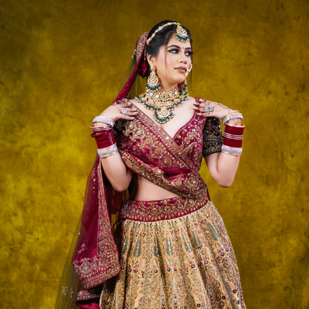 Celebrate the grace of tradition and the art of adornment with this stunning bridal ensemblean exquisite medley of heritage, craftsmanship, and modern elegance. At its heart lies a richly embellished choker, ablaze with intricate gold filigree and encrusted with shimmering Polki and colored gemstones. It’s paired with a majestic layered rani haar, featuring cascading strings of pearls and rubies that frame the bride’s neckline with resplendent charm.