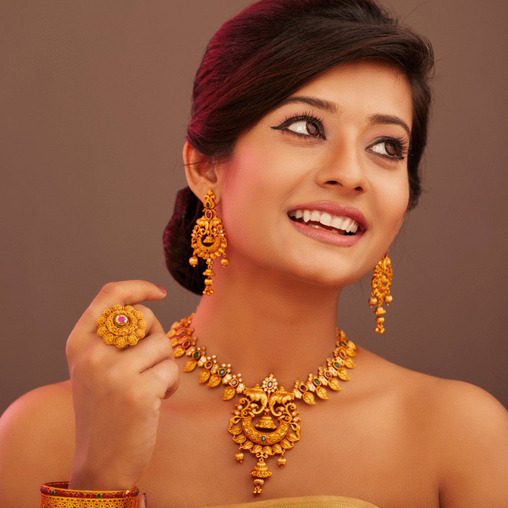 Bridal jewellery is a symbol of regality, turning every bride into a queen on her wedding day. Richly adorned with gemstones, pearls, and intricate patterns, each ornament carries the magic of tradition and modern artistry. Heavy necklaces, ornate earrings, and shimmering bangles are not just accessories—they’re treasures that enhance the bridal glow. Every piece is designed to complement the wedding attire and celebrate the moment of union. With its unmatched charm, bridal jewellery stands as a timeless reminder of elegance, culture, and the radiant beauty of a bride stepping into her new journey.